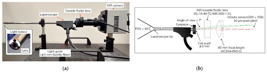 The prototype imaging system developed to perform OTN-NIR multispectral imaging under a laparoscope is depicted in Figure 2a. The device was constructed with a custom-made VIS-NIR endoscope (Machida Endoscope Co., Tokyo, Japan) [22], an NIR tunable fluidic lens (EL-16-40-TC-NIR-20D-1-C, Optotune, Dietikon, Switzerland), an achromatic lens (AC254-060-C, Thorlabs, Newton, NJ, USA), and a 320 × 256 pixel InGaAs camera (Xeva-1.7-320, Xenics, Leuven, Belgium). The optical system is illustrated in Figure 2b. As shown in the figure, the field of view (FOV) was approximately 60°, the exit pupil diameter was 3 mm, and the maximum eyepiece field angle was ±7°. The laparoscope had a light guide of 5 mm diameter bundle fiber connecting to the light source. Due to a focus shift that occurred when the wavelength was changed in the light source, the optical power of the tunable lens was set, as shown in Table 1, to adjust the focus [23]. By tuning the optical power, the angle of view changed on the order of several pixels. Therefore, based on the image at 1000 nm, which had the largest angle of view, all wavelength images were enlarged, and the positions were matched by an affine transformation.