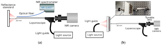 The spectral characteristics of the developed light source at 14 wavelengths were confirmed using a 99% reflectance standard (SG3052, SphereOptics GmbH, Herrsching, Germany) placed at 20 mm from the tip of the laparoscope. Subsequently, the spectrum was measured using an NIR spectrometer (NIRQuest512-2.2, Ocean Photonics, Tokyo, Japan), as shown in Figure 3a.
