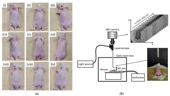 In this study, OTN-NIR multispectral imaging under a laparoscope was performed in a dark box, as shown in Figure 4b. The OTN-NIR multispectral images were captured for the live mice before tumor implantation and 14 days post-implantation. The distance between the tip of the laparoscope and the mouse was 60 mm. All procedures and protocols were approved by the Animal Care and Use Committee of the National Cancer Center (K19-016).