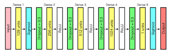 In this study, an artificial neural network with a dense multilayer was employed to identify tumors from OTN-NIR MSI data [25,26]. Each unit in a particular layer was connected to all the units in the next layer. The input value of the th unit was calculated by adding the bias to the sum from 1 to the th of the values, which is the multiplication of the output values and the corresponding weight as follows: