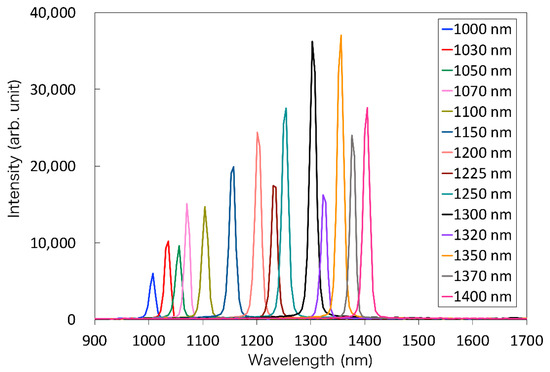 First, the NIR light transmitted through each of the 14 bandpass filters was detected by spectroscopy to validate the specifications of the filters. The results of the spectroscopy of the reflected light from the standard reflector are shown in Figure 6. Each bandpass filter was confirmed to perform as in the specifications. The system with these filters is available as the light source for MSI in the OTN-NIR wavelength range.