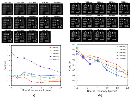 The 1951 USAF resolution chart images for each wavelength were captured to evaluate the spatial resolution of the developed laparoscopic NIR imaging device, with or without a tunable lens. From these images, the contrast of each wavelength can be calculated. These images and the calculated contrasts are shown in Figure 7a,b. According to the Rayleigh criterion, line pairs can be considered resolved if the contrast value is higher than 0.26 [27]. Although the images are focused on around 1300 nm without the tunable lens, the tunable lens setup could focus on 14 wavelengths. Moreover, the results show that the image can be resolved up to 1.6–2.0 lp/mm at 1000–1400 nm wavelengths using the tunable lens. In future, custom-made achromatic lenses may be used to address the wavelength irregularities; however, this may present disadvantages for the laparoscopic application of MSI because the number of lenses and weight will increase, and the light intensity will decrease. In contrast, although the angle of view of the tunable lens needs to be corrected for each wavelength, it has the potential to be used for laparoscopic short-wavelength IR (SWIR) MSI, which has a broader range of wavelengths because it can correct the focus shift with a single lens.