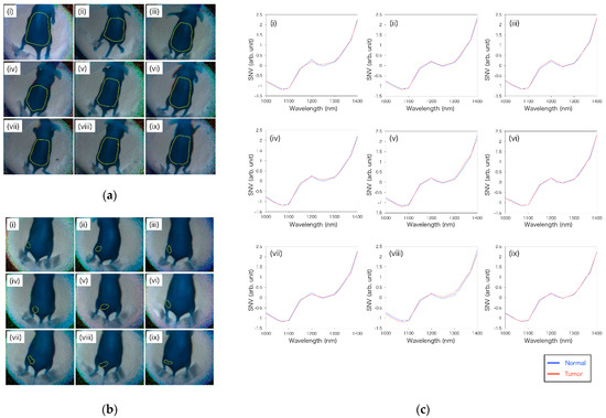 (a) Boundaries of pixels used as teaching data for the normal area before tumor implantation in nine mice; (b) boundaries of pixels used as teaching data for the tumor area of the nine tumor-implanted mice; (c) average of the standard normal variate (SNV)-processed spectrum of normal and tumor pixels in each mouse.