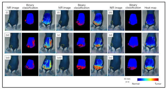 For binary classification of pixels in tumor-implanted mice, it was challenging to draw a correct boundary between the tumor and the normal areas. Therefore, the pixels that could be defined as tumor or normal were extracted, and the binary classification’s image, specificity, sensitivity, and accuracy were derived.