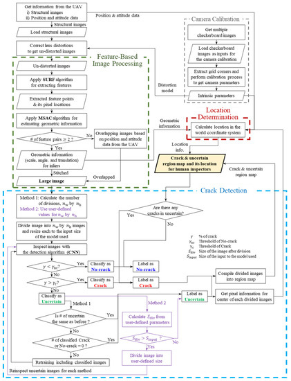 Previous studies [15,16,17,18,19,20,21] focused primarily on increasing the performance of crack detection algorithms. In addition, a number of studies have used cameras installed in UAVs to capture visual data only [26,27,28,29,30]. In this work, a UAV’s position information as well as images taken by the UAV’s camera are utilized. With this information, a proposed framework not only identifies cracks but also provides their location information. Image processing techniques are initially utilized to merge the obtained image into a large image, and a CNN based on the VGG16 model is applied to identify cracks. Then, with the UAV’s position information and outcomes of the deep learning algorithm, cracks’ location information in the world coordinate system is obtained. Lastly, it provides a full crack region map that contains the cracks boxed with red and their location information. To the best of the authors’ knowledge, this work is the first framework that can provide the presence of cracks and their locations in the world coordinate system at the same time. By combining the crack detection capability with the provision of cracks’ locations, the efficiency of large structures’ health monitoring can be improved. This proposed framework provides inspectors with the information they need before setting foot in the building, and this helps to reduce their time-consuming work. Implementation of such a framework would serve to augment inspectors’ abilities to fully inspect large structures for evidence of damage through the detection of cracks on the structures’ surface.