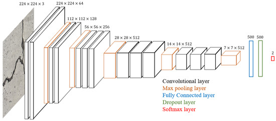 Cracks in structures are typically examined by nondestructive evaluation technologies. A visual inspection using high-resolution photography is the dominant method to inspect structures among several nondestructive technologies, such as impact-echo, ground-penetrating radar, ultrasonic surface waves testing, high-resolution photography, etc. [2,3]. Currently, inspectors must visit sites with a device to acquire visual information. However, unmanned aerial vehicles (UAVs) have been used to acquire images recently because it is easy to capture images in dangerous and/or unreachable places. Previous investigations using machine vision for crack detection have used image processing algorithms, such as Hough transform, wavelet transforms, region-based segmentation, Hessian matrix-based vesselness measurement technique, and principal component analysis to identify patterns in images that indicate cracks [4,5,6]. More recently, machine learning and deep learning algorithms to identify cracks have also become a popular method of crack detection [7,8,9,10]. Convolutional neural networks (CNNs), which are deep learning techniques, excel in object recognition applications because they are excellent at extracting features from large data sets that make adept machine learning models for object recognition [11,12,13]. Furthermore, the increasing affordability of graphics processing units (GPUs) has popularized lowering CNNs’ barrier-to-entry arising from the intense computational cost of training them [14]. For these reasons, there are many previous cases of their use in damage detection applications. In Reference [15], the authors trained CNNs on photometric stereo images of rail surfaces and utilized regularization methods to alleviate overfitting with a small training data set. For crack detection in concrete structures considering varying real-world conditions (e.g., lighting and shadow changes), CNNs were trained using various images and combined with a sliding window technique to scan any image larger than the input resolution [16]. For road crack detection, a CNN model with ConvNet architecture was adopted in Reference [17]. Wang et al. [18] proposed a two-state data augmentation method to improve the quality of crack detection. By applying the rotation method among several data augmentation methods in state one and the greedy algorithm in state two, the model was effectively trained and showed high performance for crack detection in concrete structures. Among various CNN models, the VGG16 model has been widely utilized until now. Wei et al. [19] proposed a fastener defect detection approach on a railway track using CNN, especially the VGG16 model because it can simplify the classification procedure compared to the conventional image processing technique. In addition, Yang et al. [20] utilized the VGG16 model as a base model for their study. They proposed a transfer learning method based on a deep CNN for civil infrastructure crack detection. Qu et al. [21] used the LeNet-5 to classify crack images among disordered input images and optimized the VGG16 model to detect concrete pavement cracks on the images. Moreover, studies using the VGG16 model were performed in a variety of fields, such as combustion (classification individual combustion variants [22]), agriculture (disease classification in eggplant [23]), environmental protection (classification of recyclable garbage [24]), and medical science (classification of brain tumors [25]).