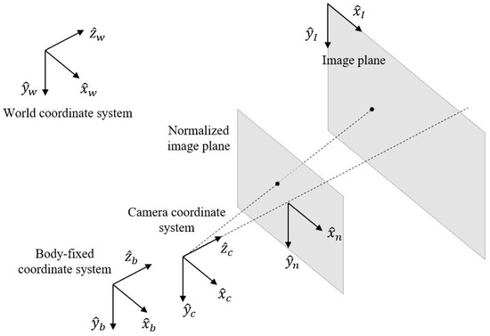 To find the location of the point in the world coordinate system, the rotation matrix, , which maps the world coordinate system into the camera coordinate system, is used. Then, the location of the point in the world coordinate system, , is provided as [42]