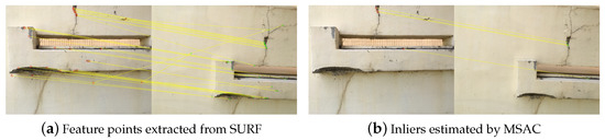 Inliers, which are correct matching features, and geometric relationships between images are obtained by using feature matching methods, such as Random Sample Consensus (RANSAC) [34] and M-estimator Sample Consensus (MSAC) [35]. In this work, MSAC is utilized to handle the outliers and to estimate parameters for homography because MSAC is more robust than RANSAC in terms of the change in the threshold of the cost function expressed as