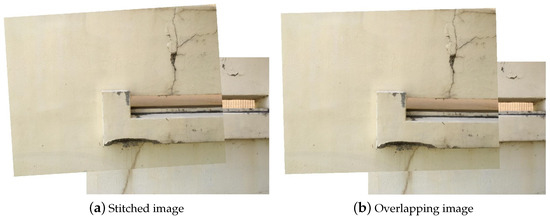 After the geometric relationship is applied to the images, the stitched image is obtained as shown in Figure 6a. Some differences between the two images are found because the attitude of the UAV is somewhat affected by control errors and/or disturbances. If sufficient inliers are not found by MSAC, stitching images are not available since the geometric information cannot be estimated due to a lack of information. In this case, overlapping images based on the UAV information should be considered as shown in Figure 6b. Two images are not well-overlapped because of the measurement error. This mismatched part may cause false identification. For this reason, it is better to use the stitched image for crack detection if possible.