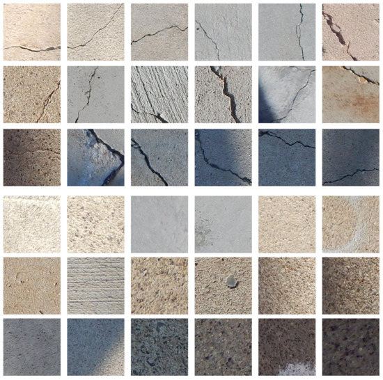 Representation of the images used to train labelling of crack images (the first three rows) and no-crack images (the last three rows).