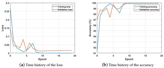 Training of the model consisted of fine-tuning the weights learned in the ImageNet competition. When retraining deep learning models, there are choices in the depth of the retraining. The model can be retrained deeper by increasing the number of convolutional layers to be fine-tuned. Many previous works employing transfer learning [38,39,40] have demonstrated varying performance with varying depths of retraining. Typically, researchers observed increasing performance with increasing depths of training at the cost of computation time. In this work, the model was fine-tuned in its entirety by using a computer that has a GTX 1080 Ti GPU with 11 GB VRAM and 3584 CUDA cores, 32 GBof memory, and an Intel i7 processor CPU with 3.9 GHz.