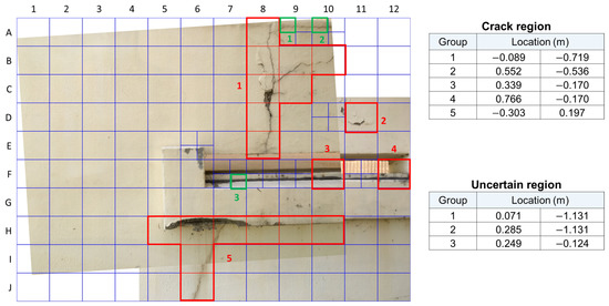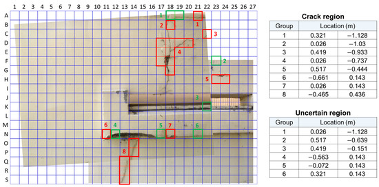 The user defines the number of times that the image is divided. The image was divided into 120 sections, 12 divisions along the x-axis and 10 divisions along the y-axis. Furthermore, if the judgement of a section is uncertain, it is divided into 4 sections of equal size to be reinspected. In this way, uncertainty in the model’s judgement of the image’s sections is reduced through reinspection. There were very few uncertain sections as a result of this method, so retraining was not utilized in Method 2. The outputs after reinspection and amalgamated location information are shown in Figure 13, and all location information is listed in Table 2.