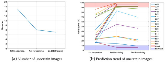 Figure 11a shows the number of uncertain images dropping with the increasing number of iterations. As shown in Figure 11b, between the first and second iterations, the judgement for section K18, which can be found in Figure 9 and Figure 10, changed from uncertain to no crack. However, there were no newly classified crack images available to make the new training data set balanced for the next iteration, so retraining stopped at the second iteration.