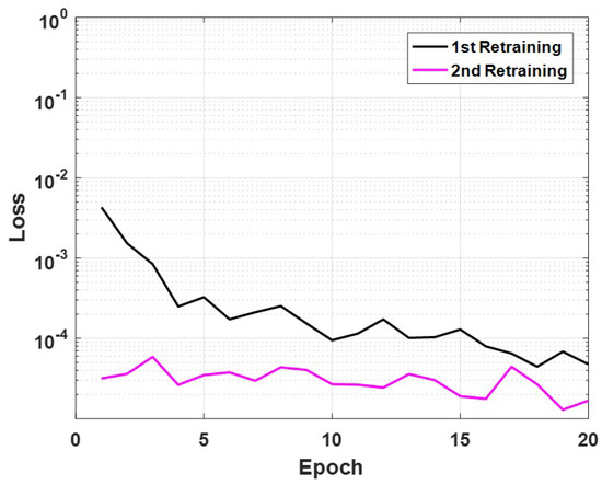 The value of the loss function during each retraining step is shown in Figure 12. The plots of these values demonstrate that retraining increases the model’s performance when given augmented data, which are 18 crack and 18 no-crack images. The reduction of loss in the first step was small, only on an order of magnitude of , but it was enough to change the judgement of 10 sections. The change in the second step was even smaller, but again, it changed the judgement of a section.