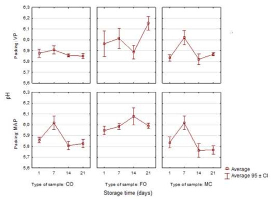 Changes in the pH value in the poultry sausages depending on the type of sample, packing and storage time (n = 3).
