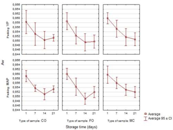 Figure 2 shows the values of the equilibrium water activity (Aw) in the model sausages. The average initial water activity values (on the 1st day) in the sausages (CO, FO, MC) were similar and amounted to 0.859 ± 0.001. Neither the form of the fish oil additive nor the packing method had a significant influence on the Aw values (p < 0.05).