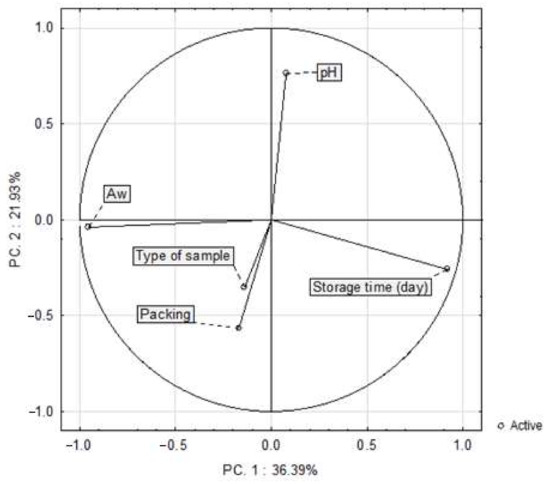 The principal component and load analysis in the analysis of water activity (Aw) and pH depending on the type of sample, packing and storage time (n = 146).