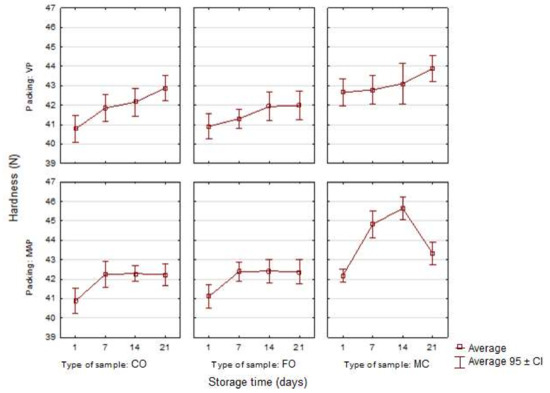 Changes in the hardness in the poultry sausages depending on the type of sample, packing and storage time (n = 10).