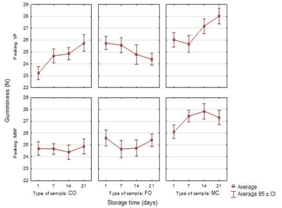 Changes in the gumminess in the poultry sausages depending on the type of sample, packing and storage time (n = 10).