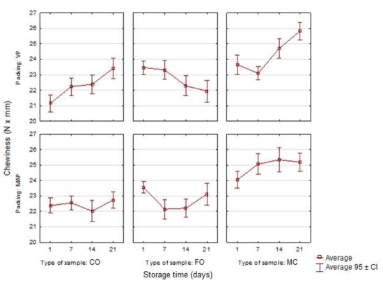 Changes in the chewiness in the poultry sausages depending on the type of sample, packing and storage time (n = 10).