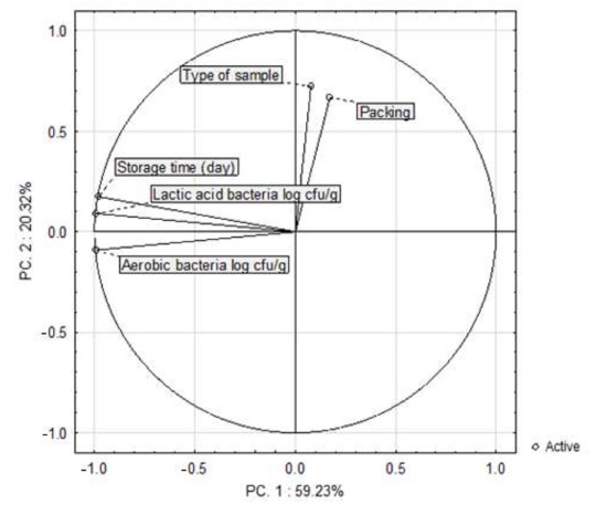 Two principal components were identified from the correlation matrix. They explained 79.55% of total variability (PC1—59.23% of variability, PC2—20.32% of variability). The correlations with input variables are shown in Figure 7. The storage time of the samples was positively correlated with the growth of bacteria. However, the total count of bacteria after 21 days of storage did not exceed the recommended safety limit in any of the samples.