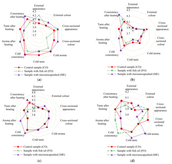 The model poultry sausages underwent sensory analyses when they were cold and then after being heated. These types of lunch meat are consumed both hot and cold. The results of the hedonic test are shown in Figure 8a–d. Neither the enrichment of the meat stuffings with the liquid and microencapsulated fish oil additive, nor the packing method caused significant differences in the batches of sausages under analysis on the 1st day of storage. However, the analysis made by the trained panel showed that the VP and MAP samples with the microencapsulated fish oil additive were rated slightly higher (84.5% on average) than the control sample (83.4% on average) and the samples with the liquid fish oil additive (82.6% on average). As shown in Figure 8a–d, most of the sensory characteristics were very similar to each other, especially during the first day of storage. The biggest, though statically insignificant changes in vacuum packed product were noticed in terms of cross-sectional color, regarding the samples with fish oil and the addition of microcapsules (p > 0.05). The difference reached 0.3 points. There were no differences in cross-sectional color when the MAP packaging method was used. In this case, however, there was disparity in texture after heating. Samples with microcapsules scored better than those with fish oil. Similar to previous examples, the difference equaled 0.3 points. For all other sensory characteristics between samples, the differences were not present or on level of 0.2–0.3 points. The total score for all graded characteristics for the VP samples of the control sausage was 48.5, for the ones with the liquid fish oil additive—47.9, and for the ones with the oil microcapsules—48.9. The overall scores for the MAP samples were: 48.3, 48.0, and 48.9, respectively.