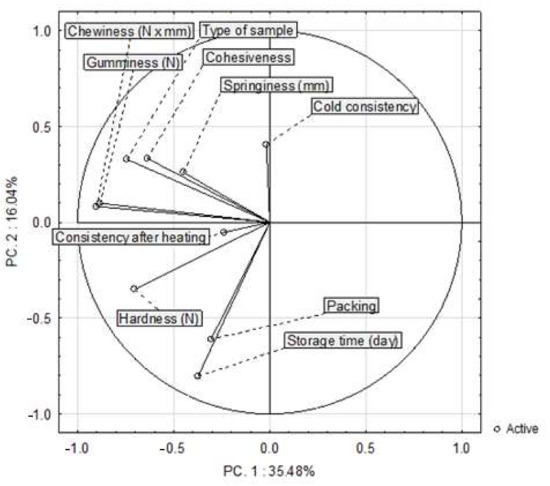 Figure 9 shows that the principal component analysis was built from all instrumentally obtained texture traits and selected discriminants of the sensory analysis (cold consistency and consistency after heating). PC 1 (35.48%) and PC 2 (16.04%) explained 51.52% of the total variance. There was a positive correlation between springiness, cohesiveness and the type of sample. Chewiness and gumminess formed separate clusters, thus indicating a positive correlation.
