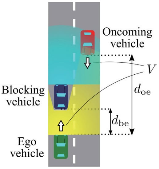 To realize safe overtaking, we assumed an overtaking scenario on a two-lane road, as illustrated in Figure 2, and estimated the amount of generated sensor data. This scenario focused on a transition period in which both automated vehicles and human-driven vehicles drive on the road, which limits cooperating vehicles. The driving scenario was that the ego vehicle tries to overtake the blue leading vehicle. Since frequent acceleration and deceleration do not occur on a straight road, the ego and the oncoming vehicles run with the same velocity V for simplicity. When the ego vehicle tries to overtake, the blue vehicle drives slow enough for simplicity. Moreover, considering that many Level 4 automated vehicles are equipped with the feature of lane centering, we assumed that all vehicles ran on the center of the road [21]. Using this lane centering function, we also assumed that beam alignment for the V2V communication was ideally performed. When the ego vehicle recognizes the oncoming vehicle by a 3D LiDAR sensor on a roof and safety is not ensured, the ego vehicle does not execute overtaking. The problem is that many beams from the LiDAR sensor are blocked by the leading vehicle. From this point, we call the leading vehicle the blocking vehicle. In this analysis, the blocking vehicle was assumed as an automated vehicle, and the oncoming vehicle was assumed as a human-driven vehicle. Therefore, the ego vehicle can communicate with the blocking vehicle and compensate for the blocked area by cooperative perception. The following sections explain the details of the scenario factors.