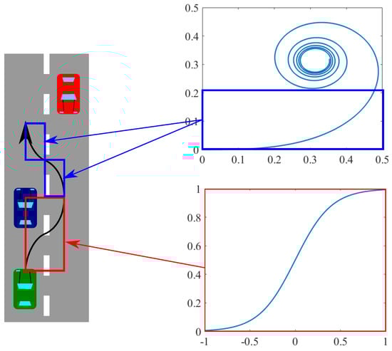 where m is the mass of the vehicle, v is the velocity of the vehicle, R is the curvature radius at the point where the vehicle places, is the coefficient of static friction, and g is gravity acceleration. Since we assumed that the ego vehicle drives along the path at a constant velocity, the minimum curvature radius without slip is from Equation (4). Finally, the parameter determines the length of the sigmoid curve. The length is determined by the duration to complete the overtaking, which was set in advance.