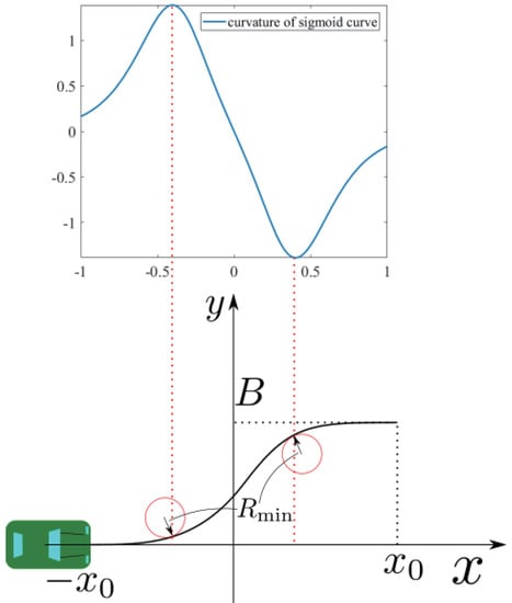 As explained, the clothoid is suitable to design the driving path in terms of linearly increasing curvature, so it is hard to handle analytically. Therefore, we used the sigmoid curve in our simulation. The characteristics of the sigmoid curve are that it is easier to configure and compute than the clothoid [25].