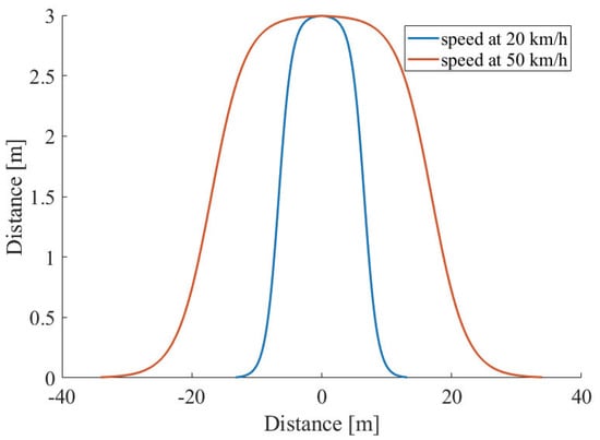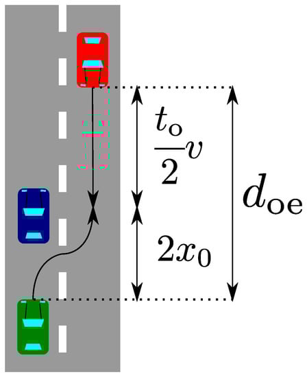 Figure 6 shows both driving paths from the start point to the collision point, where v is the velocity of the vehicle, is the duration to complete the overtaking, and is shown in Figure 4. The collision occurs when the ego vehicle moves to the center of the neighboring lane to overtake the blocking vehicle. Since the driving path is a mirror symmetry curve, when the ego vehicle arrives at the center of the neighbor lane, the oncoming vehicle moves for . Therefore, the distance required for the overtaking driving path becomes .