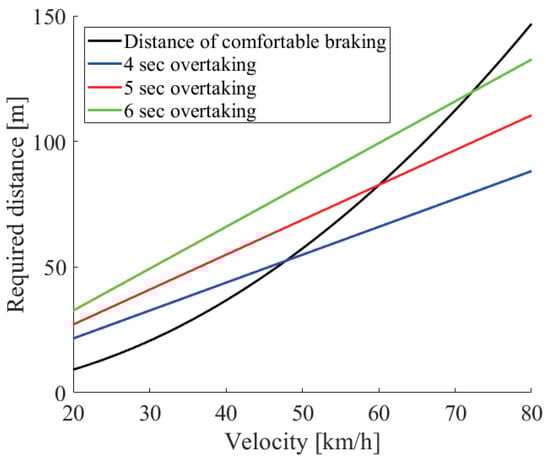 From the above discussion, we combined the distance required for the driving path and the comfortable braking. Figure 7 shows the distance required for comfortable braking and for the three driving path cases. It is shown that the driving path required a larger distance than the comfortable braking distance at a low velocity, and this was reversed at a high velocity. Therefore, considering the driving path is important especially at a low velocity. Namely, the required distance can be formulated as follows.