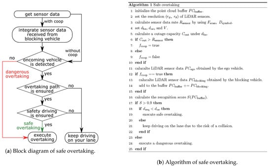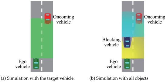 To estimate the amount of the minimum required sensor data for safe overtaking, we performed a simulation. The required sensor data rate was derived with and . Figure 17a shows the process flow of the simulation. Firstly, the output of the LiDAR sensors on the blocking and ego vehicle was simulated. When the ego vehicle used cooperative perception, it could use not only its sensor data, but also the sensor data of the blocking vehicle for the recognition process. In the recognition process, we defined that if the recognition score described in Equation (8) was more than 0.9, the ego vehicle recognized the oncoming vehicle. The recognition score was calculated under the prepared LiDAR sensor resolution sets of . If the ego vehicle failed to recognize the oncoming vehicle, it believed that there were no vehicles on the oncoming lane. Since the ego vehicle did not know exactly whether there were vehicles on the oncoming lane, this misunderstanding led to a collision. If the ego vehicle recognized the oncoming vehicle, then it additionally checked two factors. One was ensuring a comfortable braking distance for preventing a collision. The other was ensuring the driving path for overtaking. In this simulation, the required time for overtaking was set to 5 s. If the ego vehicle did not pass either, it would stay on the lane. If it passed, it could overtake the blocking vehicle.