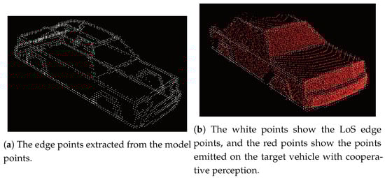 The difference of these configurations is that the right configuration includes all objects, but the left configuration only includes the target vehicle, as shown in Figure 8. In the Figure 8a case, the sensing range of the LiDAR sensor for the ego vehicle is described by the green range. This environment enables the ego vehicle to sense the target vehicle with an LoS (Line-of-Sight). In the Figure 8b case, there are two LiDAR sensors. One is on the ego vehicle, but contrary to the former case, the blue vehicle blocks the sensing, as shown by the yellow range. The other is on the blue blocking vehicle, which senses with an LoS the same as the former case. The edge points obtained in the Figure 8a case are regarded as the maximum number of edge points of the target vehicle that the ego vehicle can obtain. On the other hand, the edge points in Figure 8b can be obtained in two ways, that is using cooperative perception or not. Using cooperative perception, the edge points calculation is based on the yellow and blue sensing range, while without cooperative perception, it is only based on the yellow sensing range. Figure 9a shows the entire edge points in the model points. Figure 9b shows two points. One is the white edge points obtained under the Figure 8a configuration, and the other is the red points obtained under the Figure 8b configuration using cooperative perception. Since the red points are also obtained from an LoS place, the red and white points’ distribution is similar.