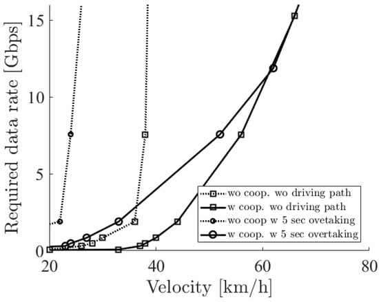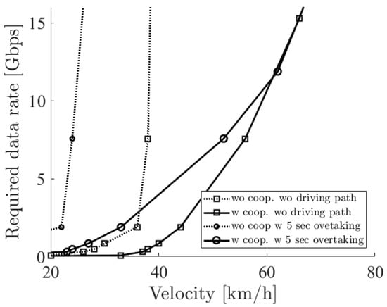 Figure 10 shows the required sensor data rate with the two options such as cooperative perception and driving path. The solid (dotted) line with square markers shows the minimum required sensor data rate to overtake with (not) using cooperative perception and not considering the driving path. The solid (dotted) line with circle markers considers the driving path with (without) cooperative perception. From the figure, firstly, we can see that all required sensor data rates rapidly increased. This rapid increase was due to the laser density, or the resolution of the LiDAR sensor, which became rapidly sparse at a far place. In the case of no cooperative perception, since the blocking vehicle interrupted the sensing, a much higher resolution was required so that the required sensor data rate increased rapidly. Secondly, there was a difference between considering the driving path or not. This reflects the result of the 5 s driving overtaking shown in Figure 7 so that no difference was seen at more than 60 km/h.