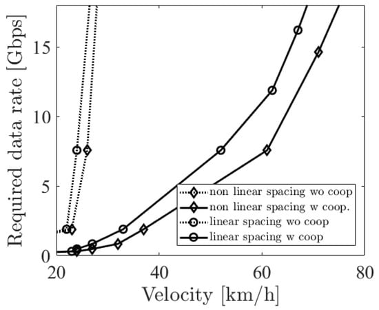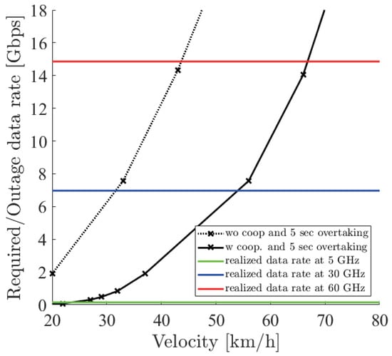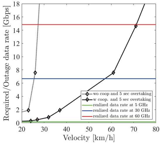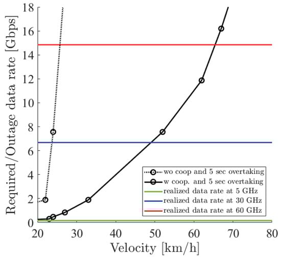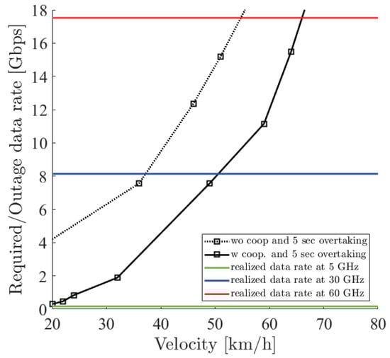Figure 18, Figure 19 and Figure 20 show the simulation result of m under the parameters of Table 1. The horizontal axis denotes the velocity of the ego vehicle, and the vertical axis denotes the sensor data rate required for the safe overtaking and the outage capacity of each carrier frequency. The black solid and dotted lines with markers show the required sensor data rate with and without cooperative perception. Since the calculation time grew drastically at more than 8 Gbps, extrapolation was used. The green, red, and blue solid lines show the realized 0.01% outage data rate for each at 5, 30, and 60 GHz. Figure 21 shows the result of m using non-linear spacing LiDAR sensors.