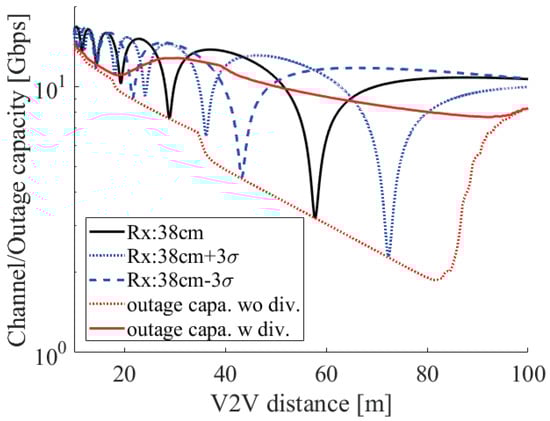 Figure 14 shows the above discussion in the case of 60 GHz. The black solid line shows the basic characteristic of the two-ray ground reflection model. The blue dotted and dashed lines show the moment of vibrating to and . We can see that the strong fading points are shifted to the left and right. The red dotted line shows the 0.01% outage capacity under no height diversity. We can see that the fading occurred at an arbitrary V2V distance. In particular, there were sharp drops at 18 and 35 m, and there was a sharp rise at 84 m. These sharp changes were due to antenna vibration, which made the fading point at 57 m move m and at 28 m move m. Considering that a shift from to happened at around 99.7% and the shift of 0.01% outage capacity was larger than the shift of , this shift was a reasonable result. The red solid line shows the outage capacity with height diversity. Although it was improved from no diversity, the outage capacity gradually changed up and down. The main reason for this change was that there were some places where both receivers encountered strong fading.