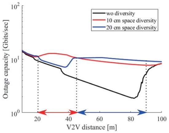 From the above analysis, we concluded that the antenna space determined short-range or long-range communication. The statistics show that the average speed on highways is about 70 km/h and on roads is about 30 km/h [37]. Moreover, we adopted the two second rule to decide the average V2V distance. From this rule, we derived the average distance on roads, which was 17 m, and on highways, which was 39 m. Based on these average distances, we proposed two additional receivers for height diversity that supported the above two values. At 60 GHz, we set the first receiver at a 5 cm space whose effective range was from 11 m to 24 m and the second receiver at a 12 cm space whose effective range was from 27 m to 57 m. In the case of 30 GHz, ten centimeters and 24 cm of space were necessary. Finally, in the case of 5 GHz, sixty centimeters and 144 cm of space were necessary. Figure 16 shows the outage capacity at 5, 30, and 60 GHz with height diversity. Note that 5, 30, and 60 GHz used three receivers as proposed in the above discussion. We can see that all outage capacities had no sharp drop and decreased linearly.