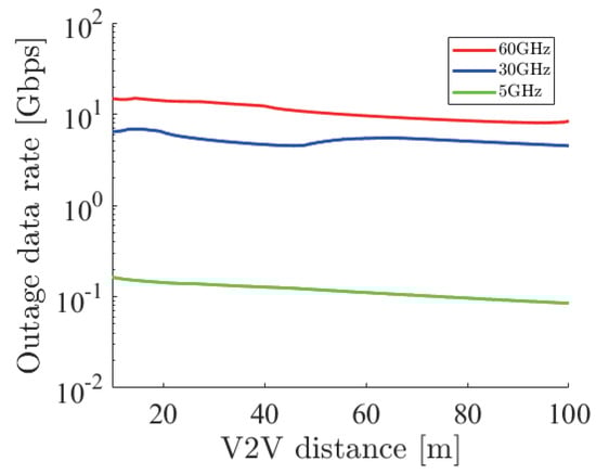 These results show that millimeter-wave communication has a big potential to contribute to safe overtaking and smooth traffic. Although the actual data rate will be lower than these outage data rates, millimeter-wave communication especially at 60 GHz has a large margin. Therefore, we concluded that millimeter-wave communication has the ability to perform safe overtaking at a high velocity, and considering the actual data rate, sixty gigahertz would be a promising frequency.