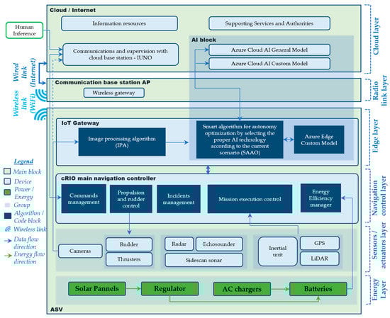 There is an extra block in both the ASV and cloud/internet main blocks called the AI (artificial intelligence) block. As explained in Section 4, it is formed of the Azure cloud general model, Azure cloud custom model, and Azure edge custom model for AI recognition according to the smart algorithm criteria described in Section 4.4.