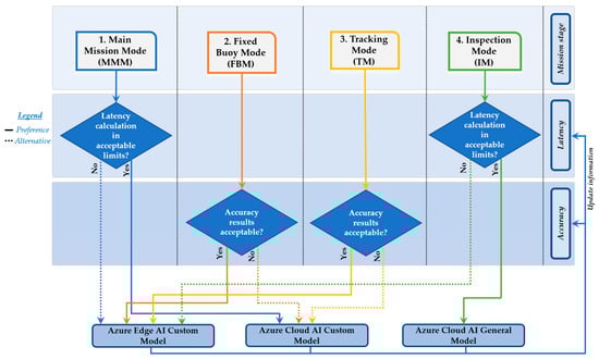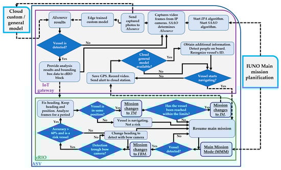 During the entire mission, the IoT gateway receives image data from the IP cameras and sensors (through the cRIO controller). If a vessel is detected, the results contain its classification (according to the trained AI models), a bounding box in the images (center, relative x–y position, and size) and accuracy (percentage). Likewise, the IoT gateway receives the image processing results from the AI recognition source for each photo sent. The AI source (edge or cloud computing) to analyze images is determined by the “Smart algorithm for autonomy optimization by selecting the proper AI technology according to the current scenario” (SAAO) described in Section 4.4. The AI source uses advanced learning techniques to analyze the results and send them to the IoT gateway. The results obtained from the AI source are used according to the specific target of each mission stage, as described in Table 1. This process is carried out throughout the mission.