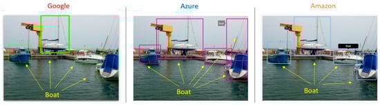 Figure 5 shows an example of three different cloud vision APIs analyzing the same image, with different types of boats in a port. All three cloud services managed to detect most of the boats in the image. The bounding box location was accurate, although the cloud response could not exactly specify the type of each boat. Our objective is not only to detect each boat in the image but also to group them into more specific categories. The general model offered by the cloud has its limits in this regard.
