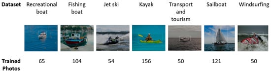The advantage of the customized model is the possibility of training it according to the use case, in addition to detecting the location of objects in the image. Our model has been trained to identify different types of vessels and their position in an image. We created our own custom object detection model to be implemented in the proposed IoT gateway using the Azure cloud service, because it supports the edge computing technologies and gives a better performance than the other solutions [11]. More than 600 photos of different types of vessels found around the inspection area in the experiment have been used to train the custom model. The model has been trained to recognize seven different types of vessels (Figure 6). The position of each vessel in the image was identified by drawing a bounding box around the object and providing the top and left pixel coordinates of the box, along with the width and height in pixels.