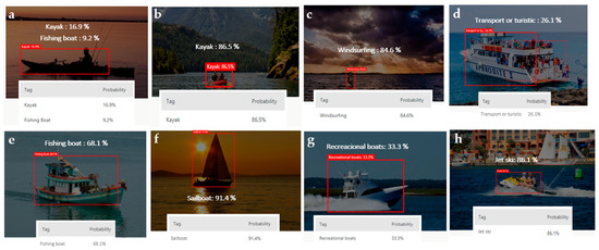 Performance of the cloud custom model object detection in discerning different boat types ((a): Kayak, (b): Kayak, (c): Windsurfing board, (d): Transport or turistic boat, (e): Fishing boat, (f): Sailboat, (g): Recreational boat, (h): Jet ski).