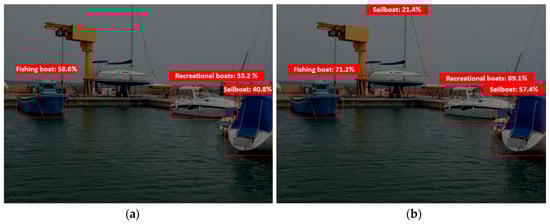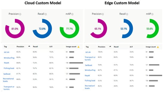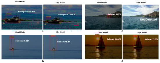 The models generated by the compact domains were optimized for the constraints of real-time classification on edge and mobile devices; therefore, they were slightly less accurate than a standard domain with the same amount of training data. Figure 9 clearly shows the difference between the custom model for cloud and edge uses, i.e., between the edge-trained model and the cloud-trained model. As can be seen, the distance from the object to the ships’ cameras affects the model’s percentage of accuracy. For instance, as shown in case 3 in the figure, the cloud model was able to recognize the vessel in the distance accurately, while the edge model was not.