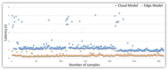 The results reported in Table 2 show the latency differences between edge and cloud models on the same machine. The average cloud model score is higher than the edge model by more than 1 s. However, the variance of the edge model is almost null compared to the cloud model, which is close to 900 ms, which justifies the edge model’s better stability in time than compared to the cloud model.