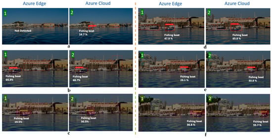 As can be seen in Figure 13, there is a difference between the edge and cloud models when detecting the same image. Sometimes, the difference between the two percentages is not so significant, although in other cases there is a notable difference, especially when the boat is at a distance, which sometimes complicates the detection by using the edge model, as seen in the example of Figure 13a, or the latency results were high, in cloud computing mostly. These values condition the SAAO response, with different decision making in each stage, according to the preferred or alternative AI source. Special attention is paid to Figure 13a,e, where the low accuracy in the edge model and the high latency in the cloud model conditioned SAAO’s decision for the alternative AI model. In Figure 13f, the alternative AI model (according to Table 3) has also been selected in IM (Stage 4), due to the risk of losing the bounding box’s center of the target in the range of vision.