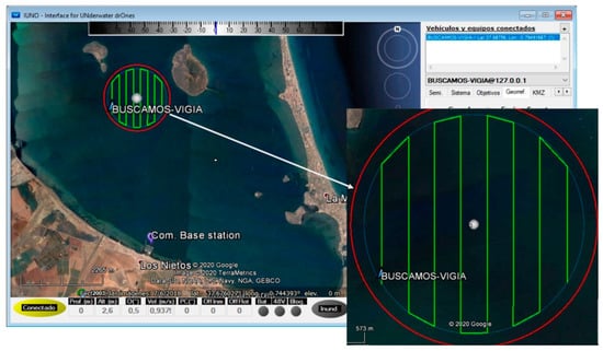 The defined inspection area has a radius of 915 m, with a surface area of 2.63 km2 and a center at coordinates 37.689634° N and 0.787109° W. To avoid detecting vessels outside the test area due to the vision field, the area covered by the main mission was reduced by a radius of 100 m, as shown in Figure 16. The mission was planned on the IUNO platform.