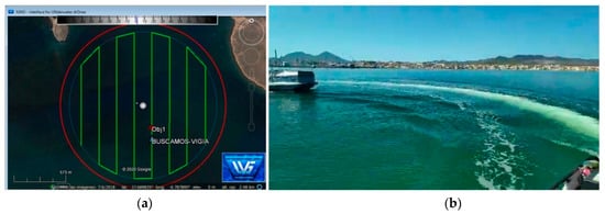 The ASV was remotely monitored and supervised from the fishing boat used as the auxiliary vessel for safety reasons during the entire mission. The auxiliary vessel was also used to verify the detection, recognition, and tracking capabilities implemented, as explained below. The different systems (control, lighting, thrusters, communications, vision, etc.) were tested before the BUSCASMOS-VIGIA mission. After successful validation, the mission was transferred from IUNO to the ASV and launched, and the vehicle headed for the starting point. Surveillance of the area began, following the previously defined route (Figure 16). From the first point of the mission to the fifth sweep in the Main Mission Mode (MMM) no incidents or detections occurred.