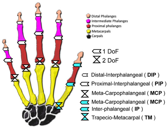 Before considering the DoF, it is important to have a good knowledge of the human hand anatomic structure, see Figure 1. A hand is made up by five fingers. Each finger, except the thumb, has three bones (distal, intermediate, and proximal phalanges), and three joints: meta-carpophalangeal (MCP), proximal-interphalangeal (PIP), and distal-interphalangeal (DIP). The thumb has two bones (distal and proximal phalanges) and two joints: meta-carpophalangeal (MCP) and inter-phalangeal (IP). Nevertheless, the thumb has an additional mobile joint: the trapecio-metacarpal (TM).